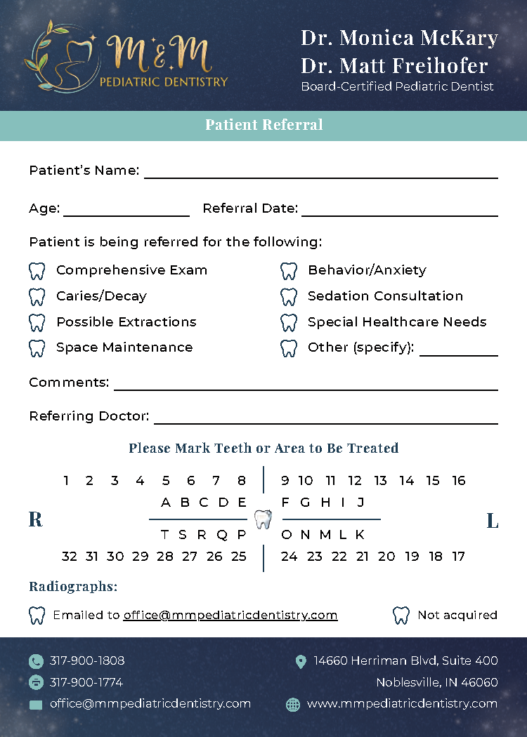If you need to refer to M&M, please download the referral page and add the the patient’s information. You can email all referrals to office@mmpediatricdentistry.com. We’re excited to see you!